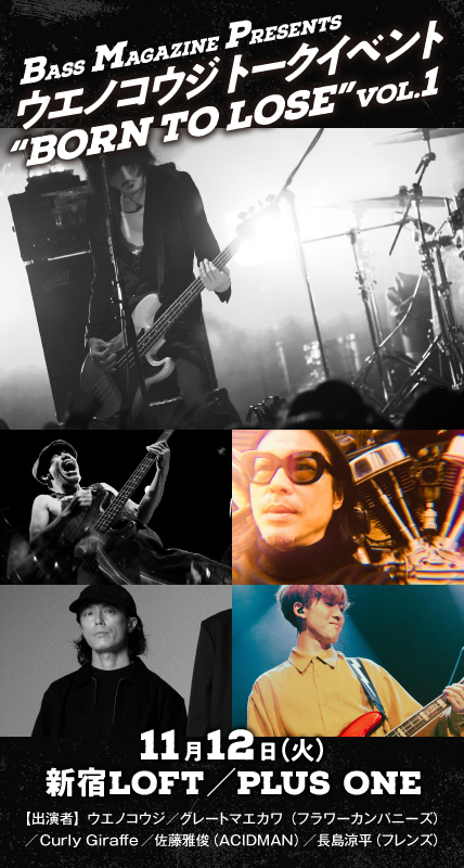ベーシストのウエノコウジが毎回ゲストを招き、酒を酌み交わしながらゆる〜くいろいろなテーマの話を繰り広げるベース・マガジンの連載企画「Born To Lose」。この人気連載が、トークイベントとして初開催されます! 第1回目となる今回のゲストはCurly Giraffe、グレートマエカワ(フラワーカンパニーズ)、佐藤雅俊(ACIDMAN)、長島涼平(フレンズ)という、ウエノコウジと気心の知れたベーシスト4人。