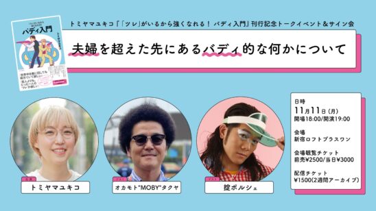 *トークイベント終了後のサイン会にご参加いただけるのは、トミヤマユキコ著書『「ツレ」がいるから強くなれる! バディ入門』を当日会場にお持ちいただいた方、および当日会場でご購入いただいた方のみとなりますので、ご注意ください。