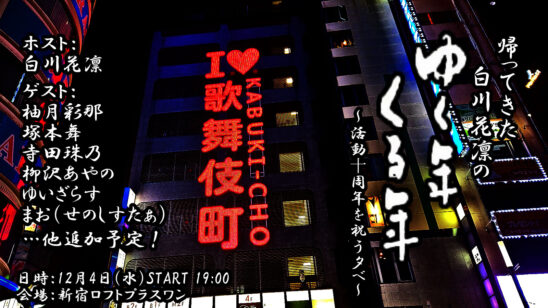 年末行っていた「白川花凛のゆく年くる年」が今年限定で復活! 今回は白川さんデビュー10周年を記念して、「だいたいデビュー10周年」の人たちをお呼びして語り合うイベントになります。デビューからのこれまでと新たなる年に向けての小粋なトークでつづる年末企画、たぶん日本で一番早い年越しイベント、ぜひお越しください!
