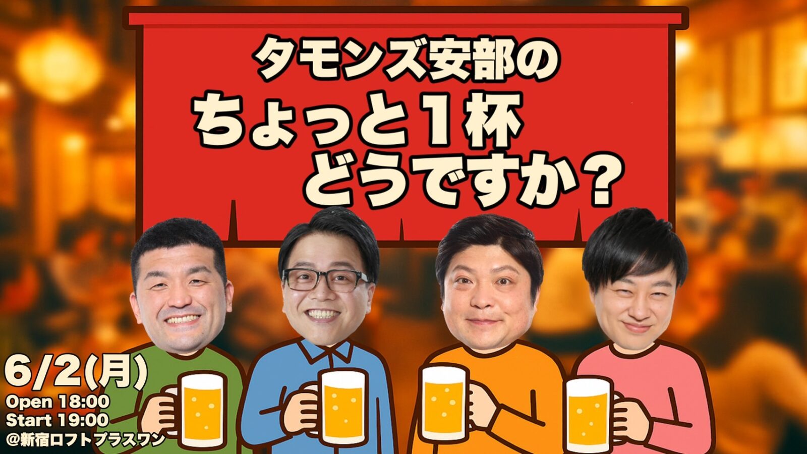 同期のタモンズ安部、イチキップリン、シマッシュレコード嶋田、すゑひろがりず三島が飲みながら食べながらお話しさせていただきます!