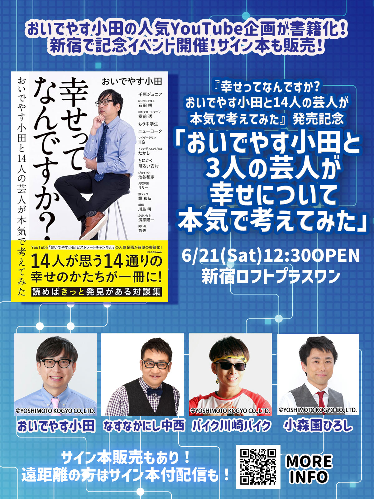 YouTube「おいでやす小田 どストレートチャンネル」内の人気企画「『芸人の幸せ』ってなんですか?」を書籍化した『幸せってなんですか? おいでやす小田と14人の芸人が本気で考えてみた』発売記念イベント! 小田さんが生で芸人と幸せについて語り合う!