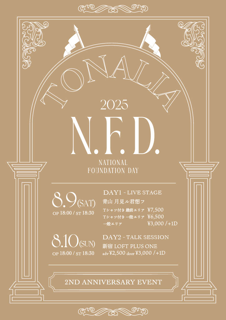 SCHEDULE 2025 08 10 Sunday 配信なし トナリア 2周年記念EVENT「N.F.D.」 DAY2 – TALK SESSION OPEN 18:00 - START 18:30 Tweet 【出演】トナリア TICKET【会場チケット】 予約 ¥2,500(+1drink) 当日 ¥3000 (+1drink) 会場チケットの予約はこちらから ●整理番号順のご入場となります●全席自由席です●再入場はお断りしております●ドリンク代別途¥600必要です。 #トナリア Share