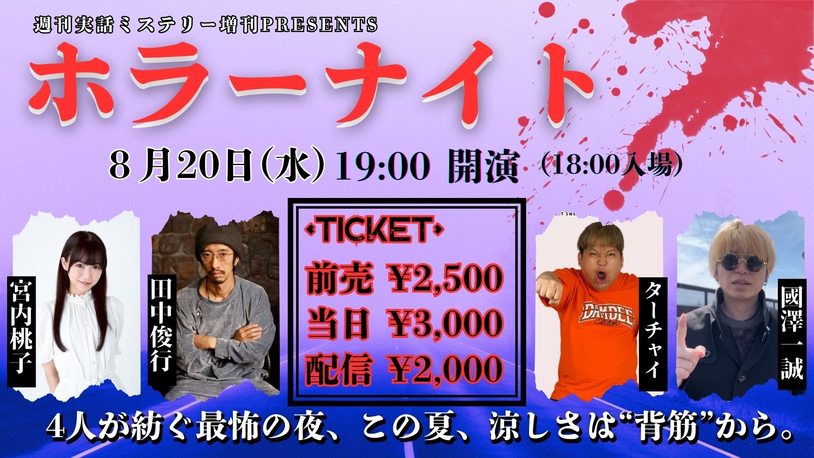 呪物に選ばれし者・田中俊行氏、心霊×エンタメの新境地を切り開くオカルト界の異端YouTuber・ターチャイ氏(オカルトスイーパーズ)、オカルト沼にハマった元アイドル・宮内桃子氏が集結!MCは國澤一誠が務める。