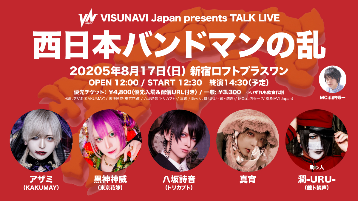 ヴィジュアル系アーティスト総合情報サイトVISUNAVI Japan主催トークライヴ「西日本バンドマンの乱~うるぴもいるよ~」が8月17日(日・昼)に新宿ロフトプラスワンで開催されることが緊催決定!