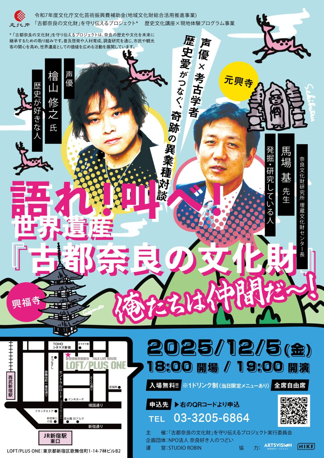本イベントへのお申し込みにあたり、お客様にご入力いただく個人情報(お名前、電話番号、メールアドレス、参加人数)は、円滑なイベント運営および参加者様へのご連絡(緊急時のご連絡、イベントに関するご案内等)を目的として、会場であるLOFT/PLUS ONEから本イベントの主催者「古都奈良の文化財」を守り伝えるプロジェクトへ提供されます。