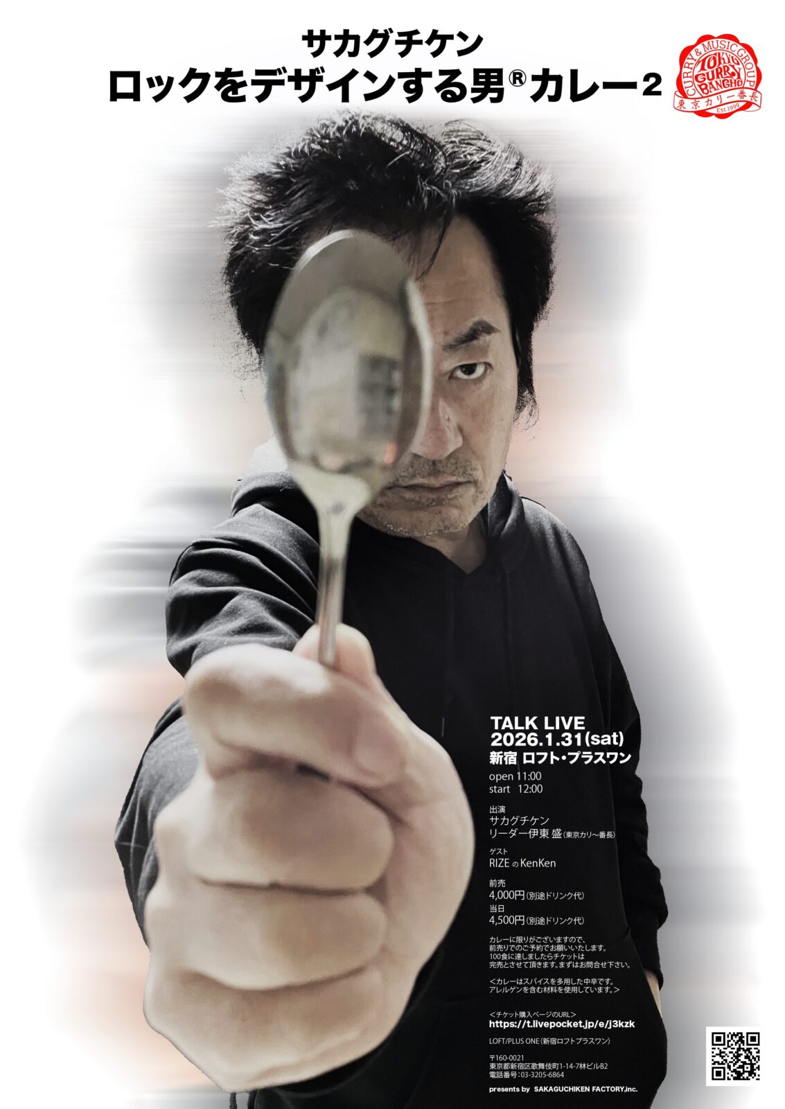 2025年8月に開催した「サカグチケン ロックをデザインする男®︎カレー」。おかげさまで大変ご好評いただき、このたび第2弾の開催が決定いたしました。今回お招きするゲストは、RIZEのベーシストとしてお馴染みのKenKenさんです。以前からご親交があるというサカグチさんとKenKenさん。どんなお話が繰り出されるか、ぜひお楽しみに。そして、もちろん今回もサカグチさんと東京カリ〜番長のスペシャルコラボによるオリジナルカレーもご用意いたします。ここでしか聞けないロックなトークを聞きに、ここでしか食べられないロックなカレーを召し上がりに、ぜひみなさま会場までお気軽に遊びにお越しください!