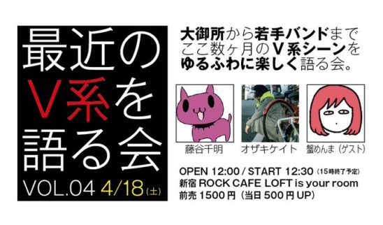 4月18日(土)に開催を予定しておりました『最近のV系を語る会 Vol.4』ですが、現在発生している新型コロナウィルス感染症の情勢を鑑み、来場者及び関係者の健康や安全面などを第一に協議しました結果、延期とさせていただく運びとなりました。ご参加をご検討いただいた皆様には大変なご迷惑をお掛けする事となり、誠に申し訳ございません。何卒ご理解のほどよろしくお願い申し上げます。