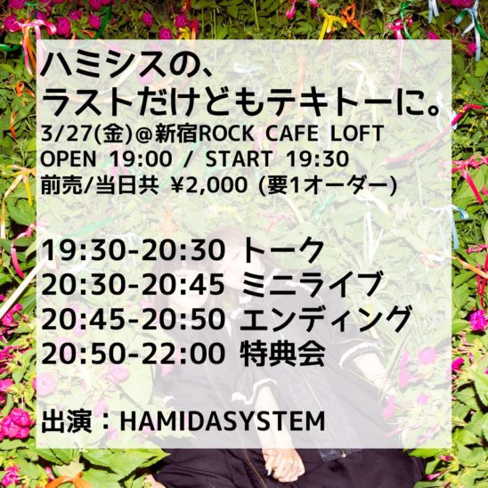 SCHEDULE 2020 03 27 Friday ハミシスの、ラストだけどもテキトーに。 OPEN 19:00 - START 19:30 Tweet 出演:HAMIDASYSTEM HAMIDASYSTEM正真正銘のラストイベント!最後だけどまったりトークします。 TICKET前売/当日:¥2,000(要1オーダー¥500以上) チケットこちらから! Share