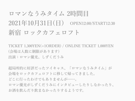 超局所的に好評だったツイキャス、「ロマンなうみタイム」が会場をロックカフェロフトに移して帰ってきました。どこに行ったわけでもありませんが……。