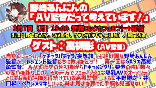 出演:野崎あんにん(AV監督、ケチャラパチャラ/妄想族)、鶴岡法斎
