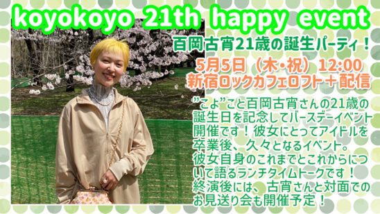 ”こよ”こと百岡古宵さんの21歳の誕生日を記念してバースデーイベント開催です!彼女にとってアイドル卒業後久々となるイベント。これまでとこれからについて語るランチタイムトークです!21歳になったばかりのこよの誕生日を祝いにお越しください!終演後には、古宵さんと対面でのお見送り会も開催予定です!