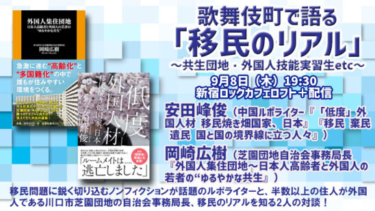 出演:安田峰俊(中国ルポライター 『「低度」外国人材 移民焼き畑国家、日本』『移民 棄民 遺民 国と国の境界線に立つ人々』)/ 岡崎広樹(芝園団地自治会事務局長 『外国人集住団地~日本人高齢者と外国人の若者の“ゆるやかな共生』)