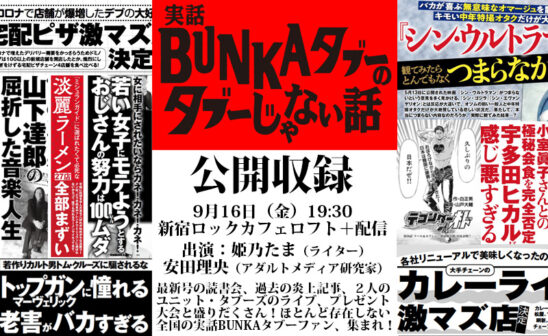 「全方位から嫌われているクオリティーペーパー(表現の自由の寄生虫マガジン)」こと実話BUNKAタブーがリアルイベントを開催! 毎回YouTubeで配信している最新号感想トーク姫乃たまと安田理央の「実話BUNKAタブーのタブーじゃない話」をお客さんを入れて公開収録を行います。9/16発売の出来立てホヤホヤの最新号を一緒に読みながら、みんなで眉をひそめよう!