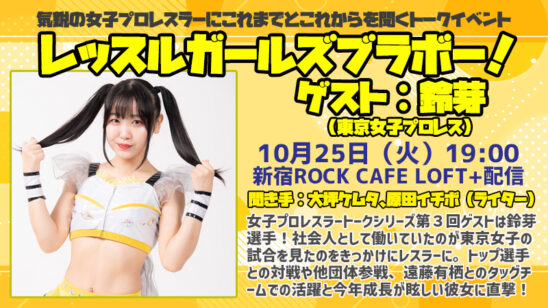 気鋭の女子プロレスラーを招いて、レスラーになる前の話から新人時代、そして現在に至るまでの成長の歴史を語ってもらうトークシリーズ、第3回ゲストは東京女子プロレスから鈴芽選手!