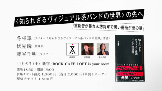 冬将軍『知られざるヴィジュアル系バンドの世界』は、膨大な情報量と冷静な筆致を通して有罪者の痛みと歓びを描き上げた決定的な一冊である。1980年代後半から1990年代後半にかけて花開いたヴィジュアル系カルチャーを同時代にシーンに巻き込まれた人間の視点から、それぞれのバンドの変遷、代表的楽曲の特徴、ファン文化の独自性、ファッションブランドや楽器メーカーとの関係に至るまで、つまりその全体の蠢きを損なわない形でキャッチせんとした画期的な書物だ。今回は冬将軍と共に、『すべての道はV系へ通ず。』の共著者でライターとしてヴィジュアル系に長年関わってきた藤谷千明と、ヴィジュアル系との出会いによって音楽と音楽批評の泥沼へのめり込んだ伏見瞬が、〈知られざるヴィジュアル系バンドの世界〉の先を捉えるために一同に介する。当日は、3人それぞれの原体験、日本の社会や人々の精神性との関係などを語りつつ、生楽器を使った「V曲のナマ楽曲分析」も行う予定。また、会場限定で、ロックカフェロフトの大迫力音響装置でVの名曲達を流すから、その魅力の強烈さをガッツリ体験していただきたいと思う。