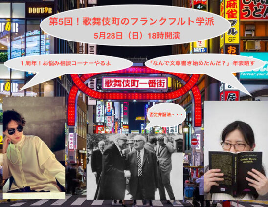 歌舞伎町のフランクフルト学派が、5月28日(日)にちょうど一周年を迎えます!その当日の夜に、第5回を開催します。