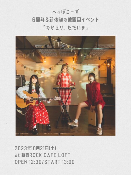 SCHEDULE 2023 10 21 Saturday DAY EVENT 6周年&新体制お披露目イベント 「おかえり、ただいま」 OPEN 12:30 - START 13:00 Tweet 出演:へっぽこーず TICKETADV ¥2,500 / DOOR ¥3,000 予約はこちら Share