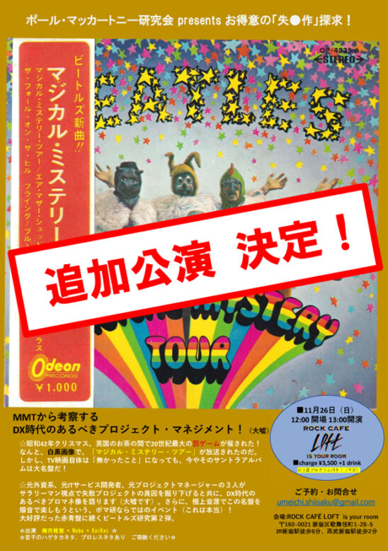 昭和42年クリスマス、英国のお茶の間で20世紀最大の罰ゲームが催された! なんと、白黒画像で「マジカル・ミステリー・ツアー」が放送されたのだ。しかし、TV映画自体は「無かったこと」になっても、今やそのサントラアルバムは大名盤だ! ポール・マッカートニー研究会 presents お得意の「失●作」探求(笑) 「マジカル・ミステリー・ツアー」から考察するDX時代のあるべきプロジェクト・マネジメント!(大噓) 元外資系、元ITサービス開発者、元プロジェクトマネージャーの3人がサラリーマン視点で失敗プロジェクトの真因を掘り下げると共に、DX時代のあるべきプロマネ像を語ります(大嘘です)。さらに、極上音源でこの名盤を爆音で楽しもうという、ポマ研ならではのイベント(これは本当)! 大好評だった赤青盤に続くビートルズ研究第2弾。若干のハゲタカネタ、プロレスネタあり ご容赦ください。 (Nobu)