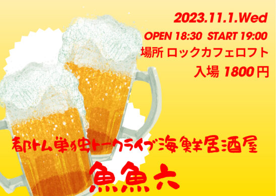 SCHEDULE 2023 11 01 Wednesday 都トム単独トークライブ海鮮居酒屋 魚魚六 OPEN 18:30 - START 19:00 Tweet 出演 都トム ※状況に応じて出演者の変更、キャンセルになる可能性もございます。ご了承ください。 ※ご入場料は現金のみでの対応になります。 TICKET《来場チケット》前売り¥1,800(要1オーダー)/当日¥2,300(要1オーダー) 予約はPeatixにて10/7 22:00より受付開始! Share