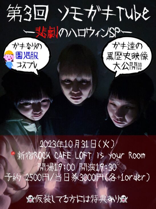 SCHEDULE 2023 10 31 Tuesday 『第3回 ソモガキTube -悲劇のハロウィンSP-』 OPEN 19:00 - START 19:30 Tweet 出演 トマラナイ チヒロ アオイ アオネ シャンシャン マイ (SOMOSOMO) TICKET前売り¥2,500 当日¥3,000 (共に要1オーダー) ご予約は下記予約フォームにて 10/21(土)22:00より受付開始! Share このイベントの予約は締めきりました。