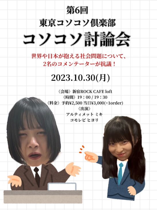 SCHEDULE 2023 10 30 Monday 『第6回 東京コソコソ倶楽部-コソコソ討論会-』 OPEN 19:00 - START 19:30 Tweet 出演 アルティメット ミキ コモレビ ヒヨリ TICKET前売り¥2,500 当日¥3,000 (共に要1オーダー) ご予約は下記予約フォームにて 10/22(日)18:00より受付開始! Share このイベントの予約は締めきりました。