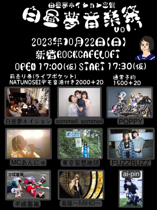 SCHEDULE 2023 10 22 Sunday 白昼夢音楽祭 OPEN 17:00 - START 17:30 Tweet TICKET予約 CD付き¥2,000+2D/通常予約¥1,500+2D Share