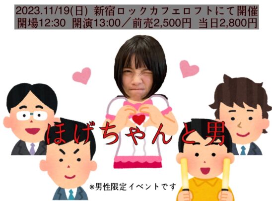 SCHEDULE 2023 11 19 Sunday DAY EVENT ほげちゃんと男 OPEN 12:30 - START 13:00 Tweet 出演:ほげちゃん こちらのイベントは男性限定イベントです。女性の方はご入場できませんのでご了承ください。 TICKET前売¥2,500/当日¥2,800(共に要1オーダー¥500以上) チケットはLive Pocketにて10/26 20:00より販売開始! Share