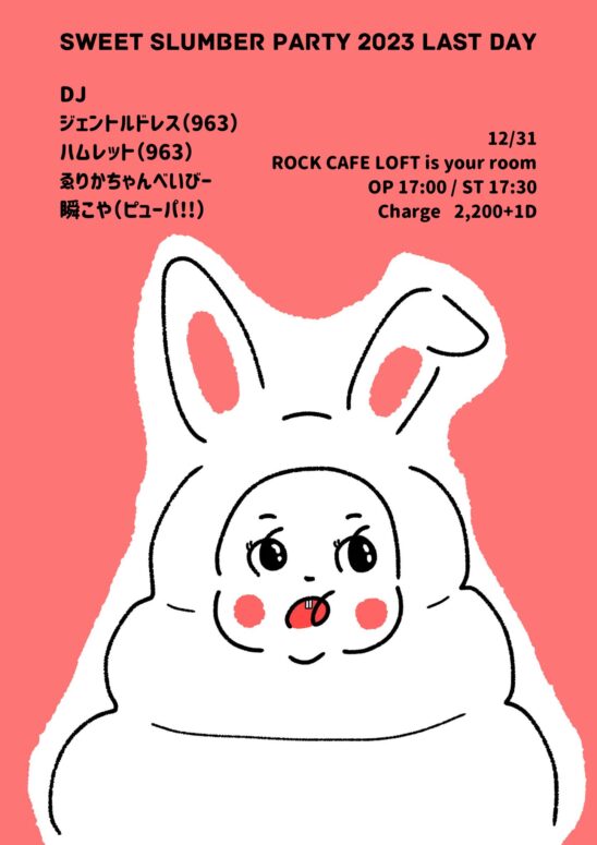SCHEDULE 2023 12 31 Sunday Sweet Slumber Party 2023 Last Day OPEN 17:00 - START 17:30 Tweet DJ ジェントルドレス(963) ハムレット(963) ゑりかちゃんべいびー 瞬こや(ピューパ!!) TICKETCharge:¥2,200+1D Share このイベントの予約は締めきりました。
