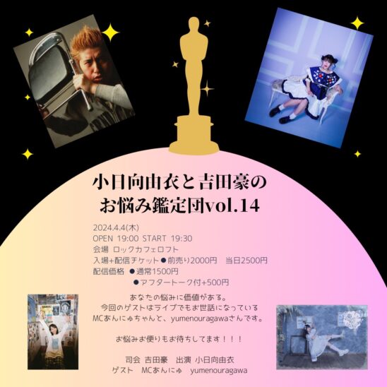 吉田豪さん南波一海さんからも一目置かれる“シンガーソングライター” レジェンドこと、小日向由衣さんが皆様からのお悩みを募集して、それを“進行兼カウンセラー”吉田豪さんと共に答えていくイベントだったのですが、いつのまにか小日向さんが豪さんにお悩みを相談をしているでおなじみ『小日向由衣と吉田豪のお悩み鑑定団』第14弾 開催決定!!