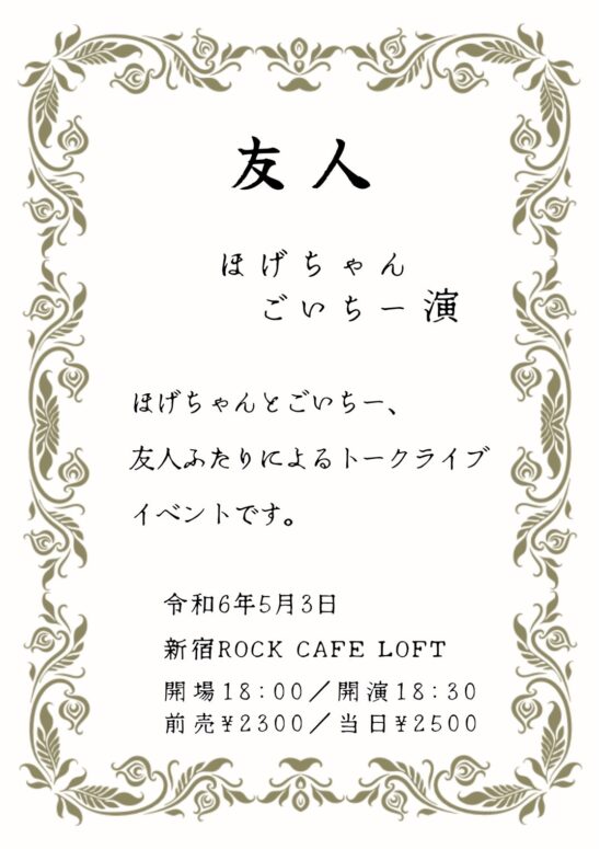 SCHEDULE 2024 05 03 Friday 友人 OPEN 18:00 - START 18:30 Tweet 出演 ほげちゃん ごいちー TICKET前売:¥2,300 / 当日:¥2,500 チケットはLive Pocketにて4/14 21:00より販売開始! Share