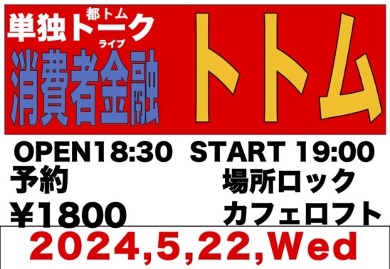 SCHEDULE 2024 05 22 Wednesday 都トム単独トークライブ消費者金融 トトム OPEN 18:30 - START 19:00 Tweet 出演 都トム ※状況に応じて出演者の変更、キャンセルになる可能性もございます。ご了承ください。 ※ご入場料は現金のみでの対応になります。 TICKET《来場チケット》前売り¥1,800(要1オーダー)/当日¥2,300(要1オーダー) 予約はPeatixにて4/14 22:00より受付開始! Share