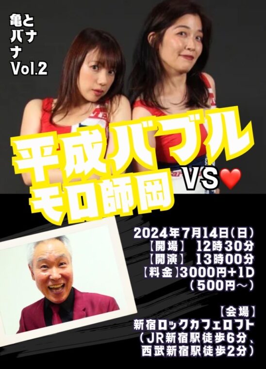 SCHEDULE 2024 07 14 Sunday DAY EVENT 『亀とバナナ Vol.2』 OPEN 12:30 - START 13:00 Tweet 平成バブル vs モロ師岡 TICKET料金 ¥3,000(要1オーダー¥500以上) ご予約は出演者のSNSにて受付! Share