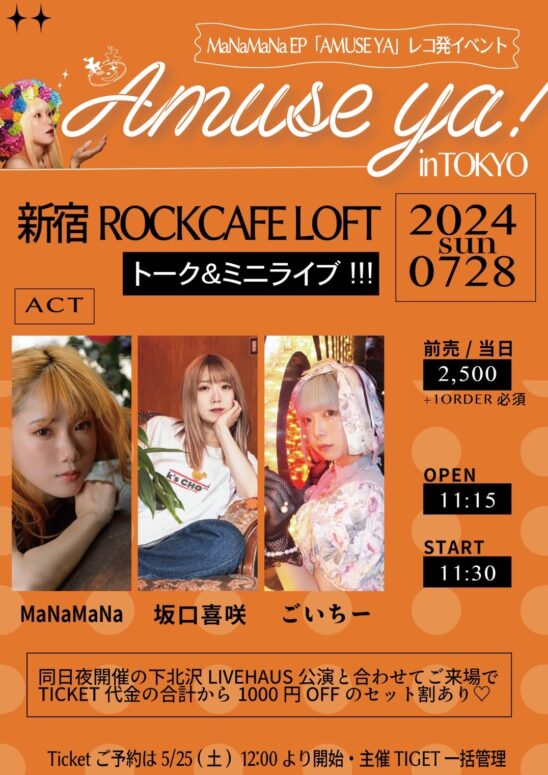 SCHEDULE 2024 07 28 Sunday DAY EVENT 「AMUSE YA! TOUR -トーク&ミニライブ!!!-」in TOKYO OPEN 11:15 - START 11:30 Tweet 出演 MaNaMaNa 坂口喜咲 ごいちー TICKET料金 ¥2,500(要1オーダー¥500以上) ご予約はこちらにて5/25 12:00より受付開始! Share