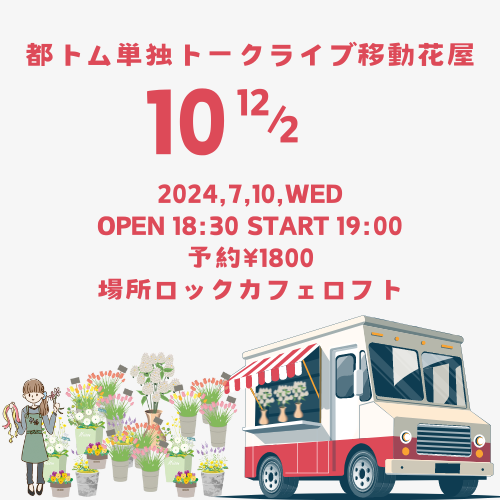 SCHEDULE 2024 07 10 Wednesday 都トム単独トークライブ移動花屋 10 12/2 OPEN 18:30 - START 19:00 Tweet 出演 都トム ※状況に応じて出演者の変更、キャンセルになる可能性もございます。ご了承ください。 ※ご入場料は現金のみでの対応になります。 TICKET《来場チケット》前売り¥1,800(要1オーダー)/当日¥2,300(要1オーダー) 予約はPeatixにて6/8 22:00より受付開始! Share