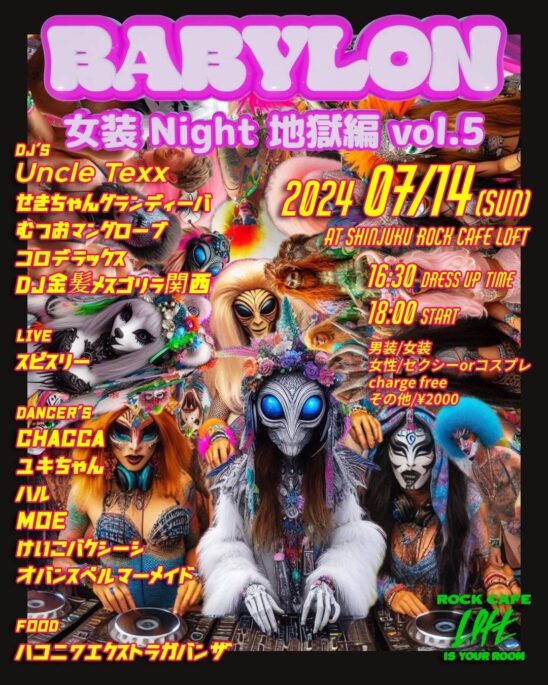 SCHEDULE 2024 07 14 Sunday Babylon 女装Night 地獄編 Vol.5 OPEN 16:30 - START 18:00 Tweet TICKETcharge ¥2,000 要1D Share