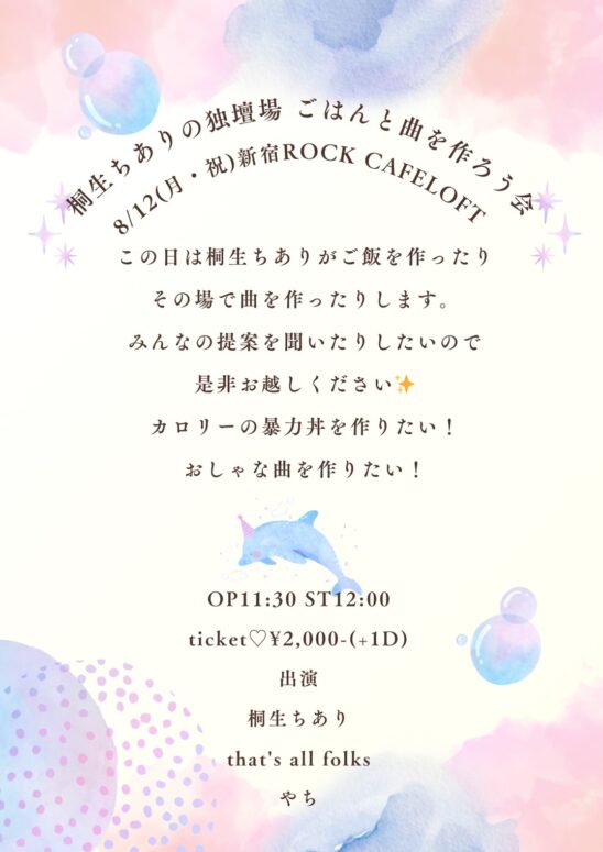 SCHEDULE 2024 08 12 Monday DAY EVENT 桐生ちありの独壇場Vol.14 ごはんと曲を作ろう2024 OPEN 11:30 - START 12:00 Tweet 出演 桐生ちあり that’s all folks やち TICKET料金:予約¥2,000 / 当日¥2,500(共に要1オーダー¥500以上) ご予約は下記の予約フォームにて受付! Share このイベントの予約は締めきりました。