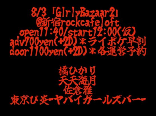 SCHEDULE 2024 08 03 Saturday DAY EVENT Girly Bazaar2 OPEN 11:40 - START 12:00 Tweet 橘ひかり 天天海月 佐倉雅 東京ぴ炎 TICKET早割 ¥700+2D(¥1,200)予約 ¥1,200+2D(¥1,200)ご予約は各種出演者にて受付※再入場不可 Share