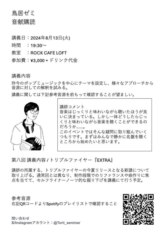 SCHEDULE 2024 08 13 Tuesday 鳥居ゼミ音献購読第八回 OPEN 19:00 - START 19:30 Tweet 出演:鳥居真道 TICKET予約 ¥3,000(要1オーダー¥500以上) ご予約はこちらから! Share