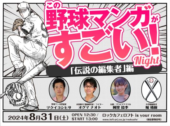 流浪の名物記事「この野球マンガがすごい!」が贈るトークイベント第二弾! 今回は業界の「野球マンガ仕掛け人」として知られる伝説の編集者・堀靖樹さんが登場!! あの有名作品や先生たちのウラ話が続々と明かされる!? 野球好き、マンガ好きなら誰でも楽しめます。〝ココだけの話〟を聞きたい方はぜひ!