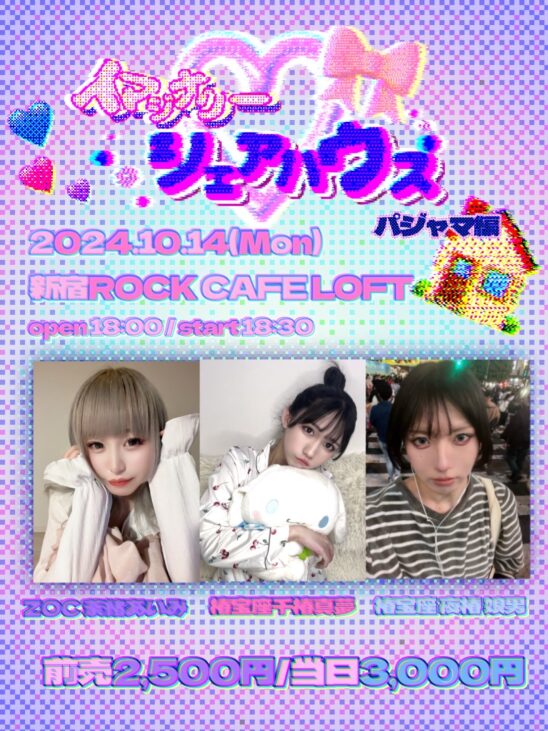 SCHEDULE 2024 10 14 Monday 『イマジナリー♡シェアハウス ぱじゃま編』 OPEN 18:00 - START 18:30 Tweet 出演 荼緒あいみ(ZOC) 千椿真夢(椿宝座) 夜椿娘男(椿宝座) TICKET前売2,500円/当日3,000円 チケットはLive Pocketにて9/25 19:00より販売開始! Share