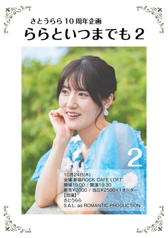 SCHEDULE 2024 10 24 Thursday さとうらら10周年企画 「ららといつまでも2」 OPEN 19:00 - START 19:30 Tweet 出演 さとうらら S.A.L. as ROMANTIC PRODUCTION TICKET前売¥2000 / 当日¥2500+1オーダー ご予約はこちらから! Share
