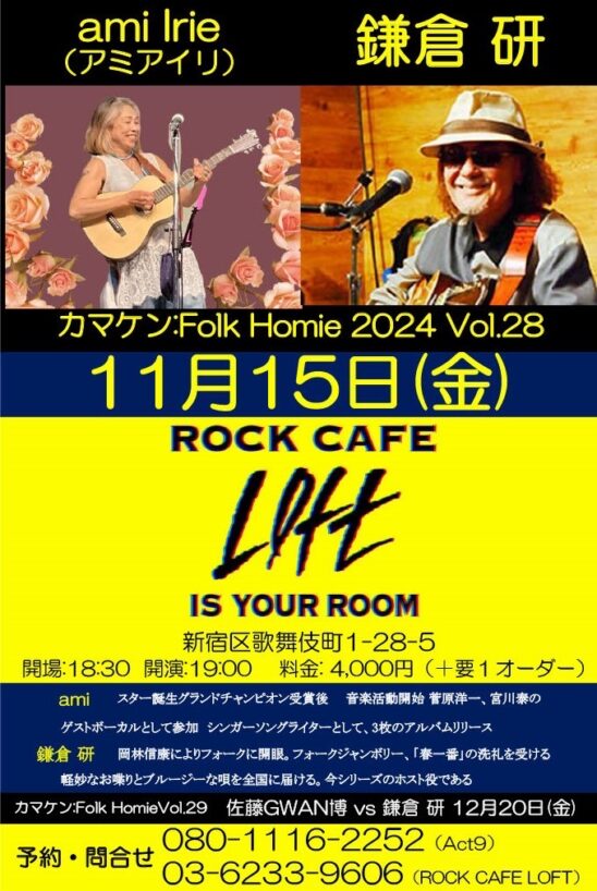 SCHEDULE 2024 11 15 Friday カマケン:Folk Homie 2024 Vol.29 OPEN 18:30 - START 19:00 Tweet 出演:ami Irie(アミアイリ) vs 鎌倉研 問合せ 080-1116-2252(Act9) TICKET料金 :予約¥4,000/当日¥4,500(要1オーダー¥500以上) ご予約は下記の予約フォームにて! Share このイベントの予約は締めきりました。