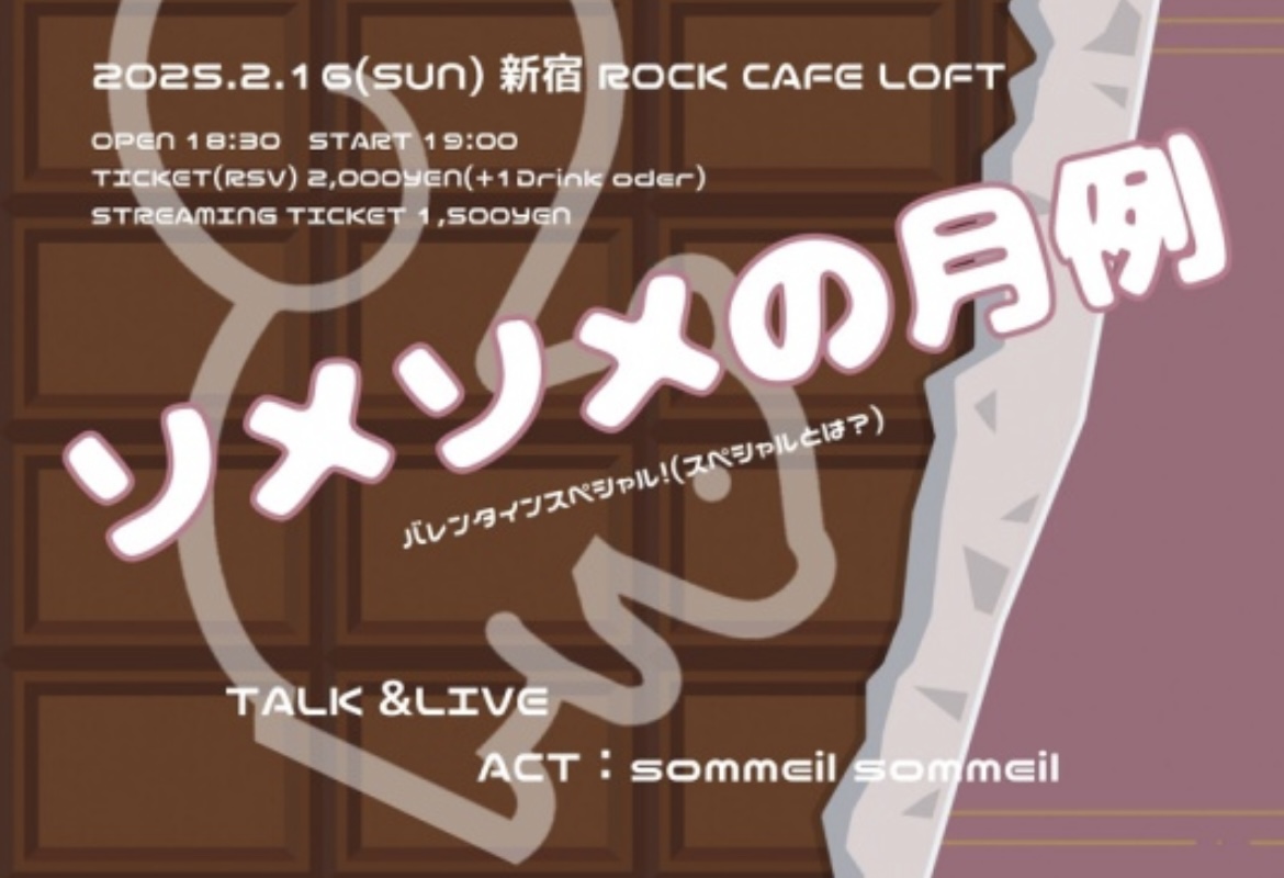 SCHEDULE 2025 02 16 Sunday 『ソメソメの月例 バレンタインスペシャル』 OPEN 18:30 - START 19:00 Tweet 出演:sommeil sommeil TICKET配信チケット ¥1,500 チケットはキャスマーケットにて販売! ※配信アーカイブは3/2まで視聴可能 前売¥2,000 / 当日¥2,500(共に要1オーダー¥500以上) ご予約は下記の予約フォームにて受付いたします。 Share このイベントの予約は締めきりました。