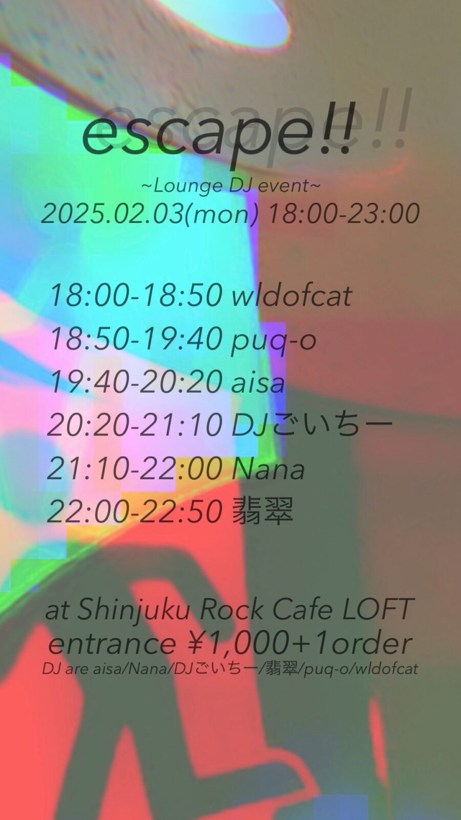 SCHEDULE 2025 02 03 Monday escape!! OPEN 18:00 - START 18:00 Tweet DJ aisa Nana DJごいちー 翡翠 puq-o wldofcat TICKETentrance ¥1,000+1 order Share