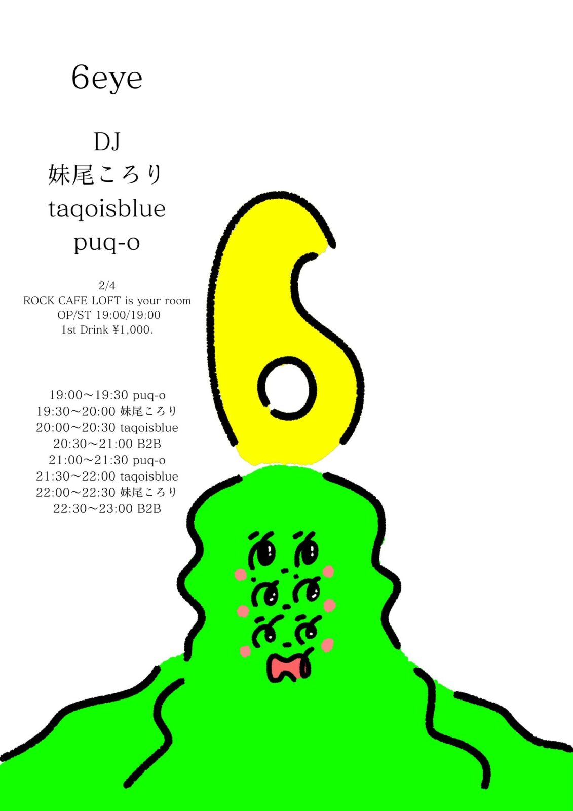 SCHEDULE 2025 02 04 Tuesday 6eye OPEN 19:00 - START 19:00 Tweet DJ 妹尾ころり taqoisblue puq-o TICKET1st Drink ¥1,000 Share