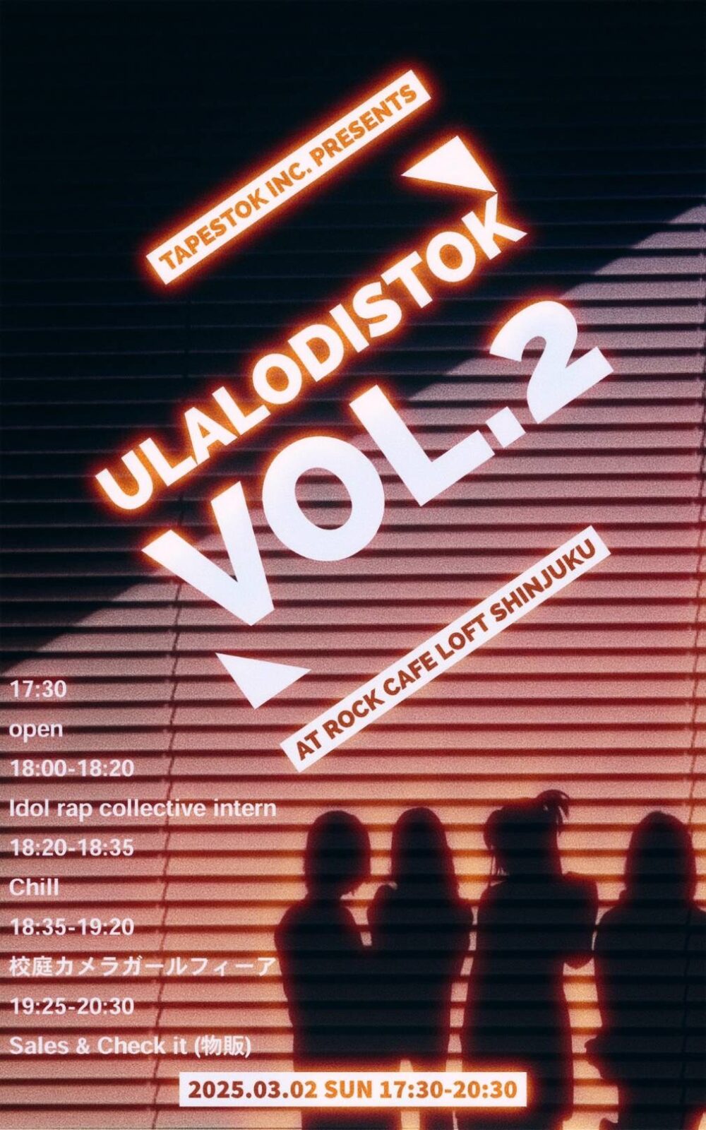SCHEDULE 2025 03 02 Sunday TAPESTOK INC. presents ulalodistok vol.2 OPEN 17:30 - START 18:00 Tweet ACT/ 校庭カメラガールフィーア Idol rap collective intern TICKET予約 ¥2,000+1D ご予約はこちらから! Share