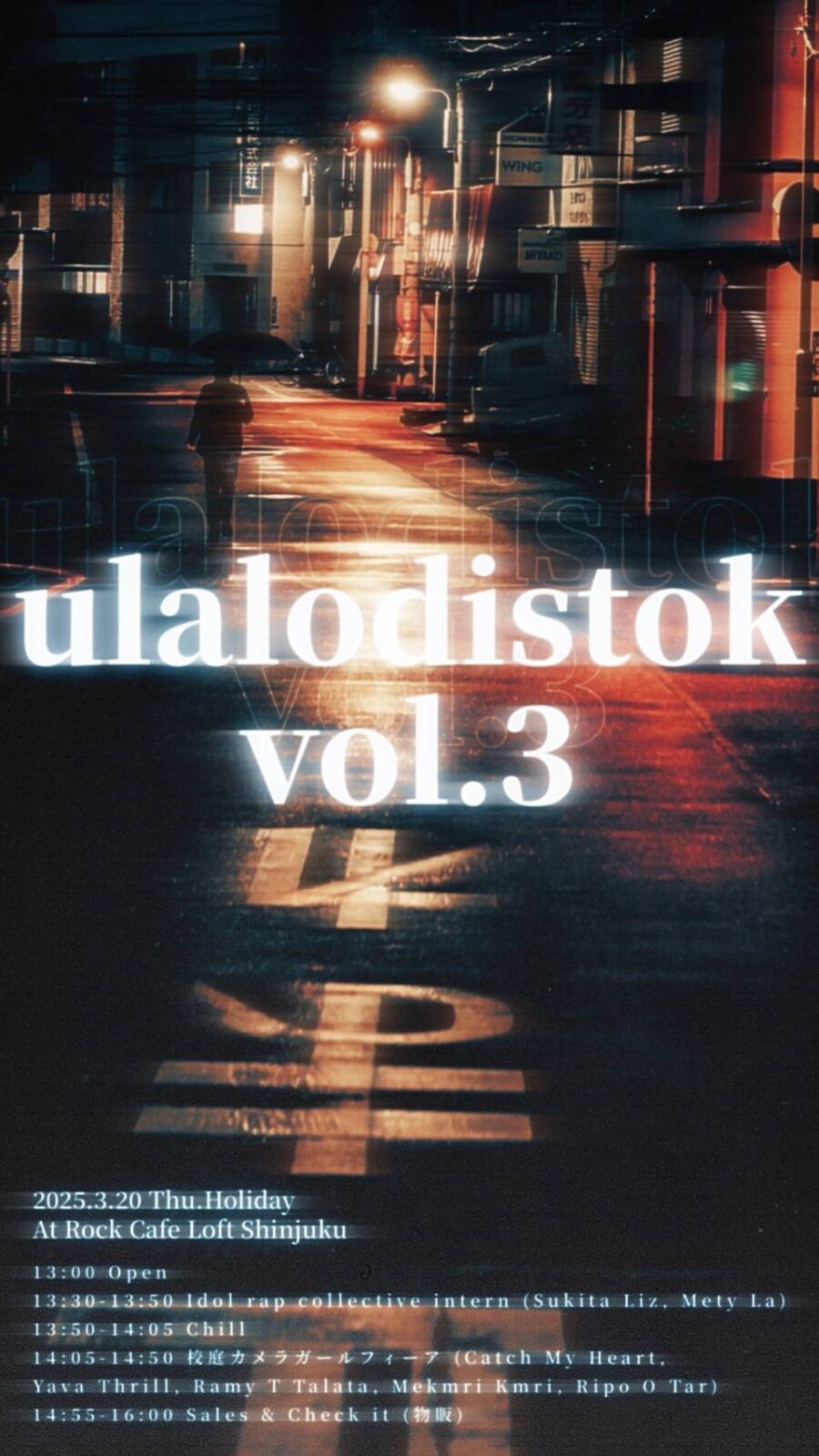 SCHEDULE 2025 03 20 Thursday DAY EVENT ulalpdistok vol.3 OPEN 13:00 - START 13:30 Tweet Act 校庭カメラガールフィーア Idol rap collective intern TICKETEntrance ¥2,000+1D Share