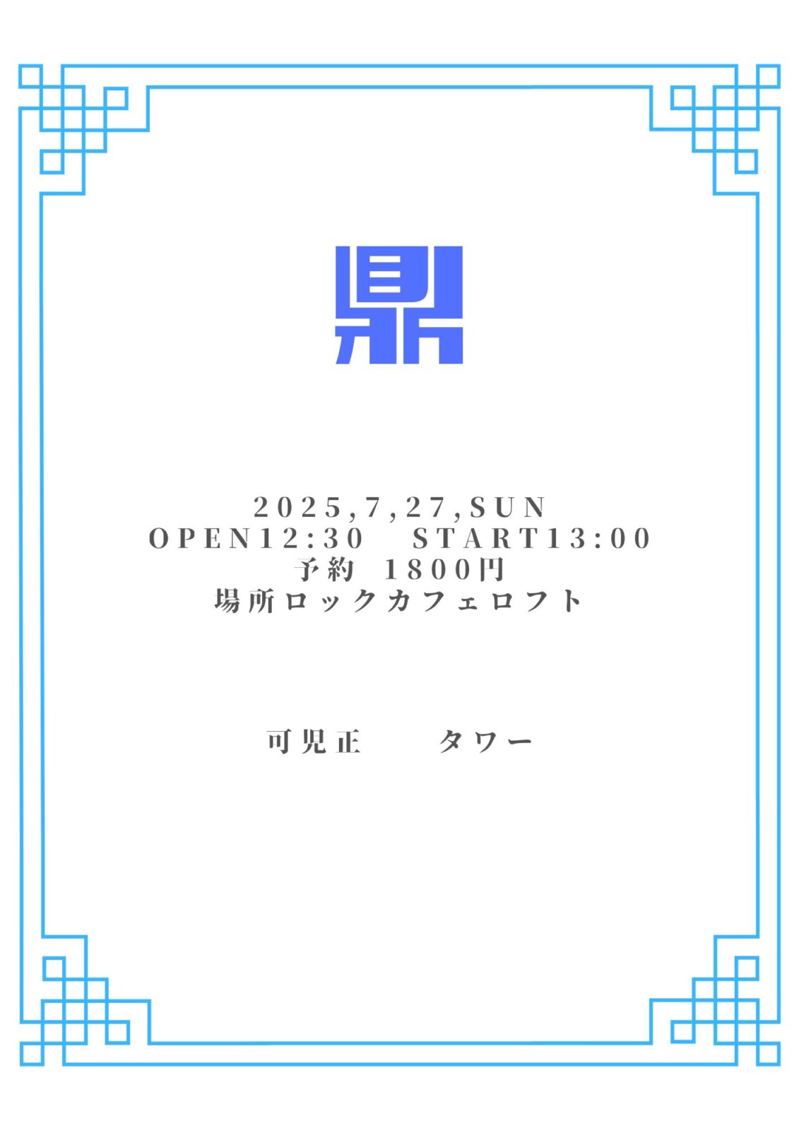 SCHEDULE 2025 07 27 Sunday DAY EVENT 鼎 OPEN 12:30 - START 13:00 Tweet 出演 可児正 タワー ※状況に応じて出演者の変更、キャンセルになる可能性もございます。ご了承ください。 ※ご入場料は現金のみでの対応になります。 TICKET《会場チケット》 前売り¥1,800(要1オーダー)/当日¥2,300(要1オーダー) 予約はPeatixにて6/7、22時から受付開始! #可児正#タワー Share