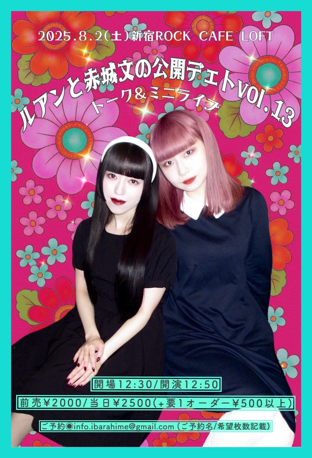 SCHEDULE 2025 08 02 Saturday DAY EVENT #ルアンと赤城文の公開デェト Vol.13 OPEN 12:30 - START 12:50 Tweet 【出演】 ルアン 赤城文 TICKET予約 ¥2,000 / 当日 ¥2,500 (+要1オーダー¥500以上) ご予約info.ibarahime@gmail.com (ご予約名/希望枚数記載) Share