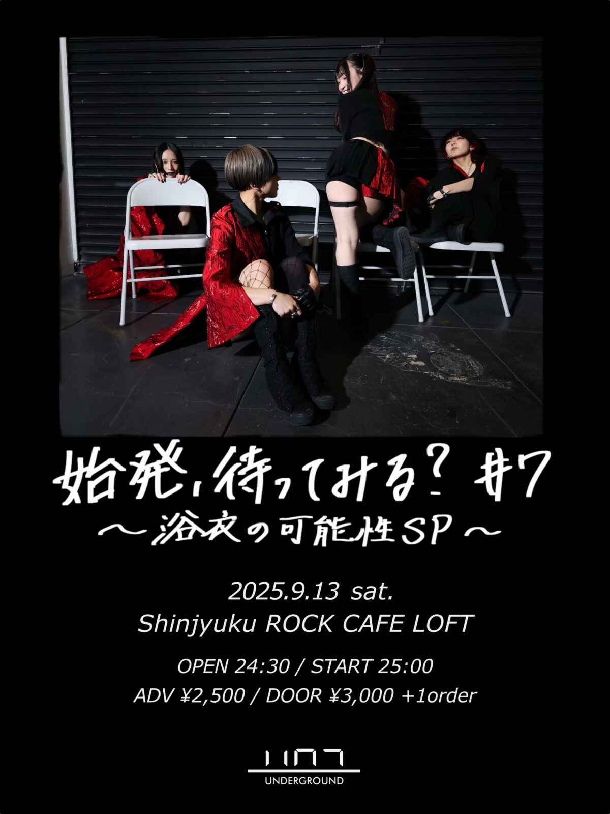 SCHEDULE 2025 09 13 Saturday MIDNIGHT EVENT 始発待ちアンダーグラウンドの 『始発、待ってみる? #7』 浴衣の可能性SP OPEN 24:30 - START 25:00 Tweet 出演 始発待ちアンダーグラウンド ※状況に応じて出演者の変更、キャンセルになる可能性もございます。ご了承ください。 TICKET《会場チケット》 前売り¥2,500/当日¥3,000(ともに+1オーダー) 予約はチゲットにて8/29、21時から受付開始! #始発待ちアンダーグラウンド Share